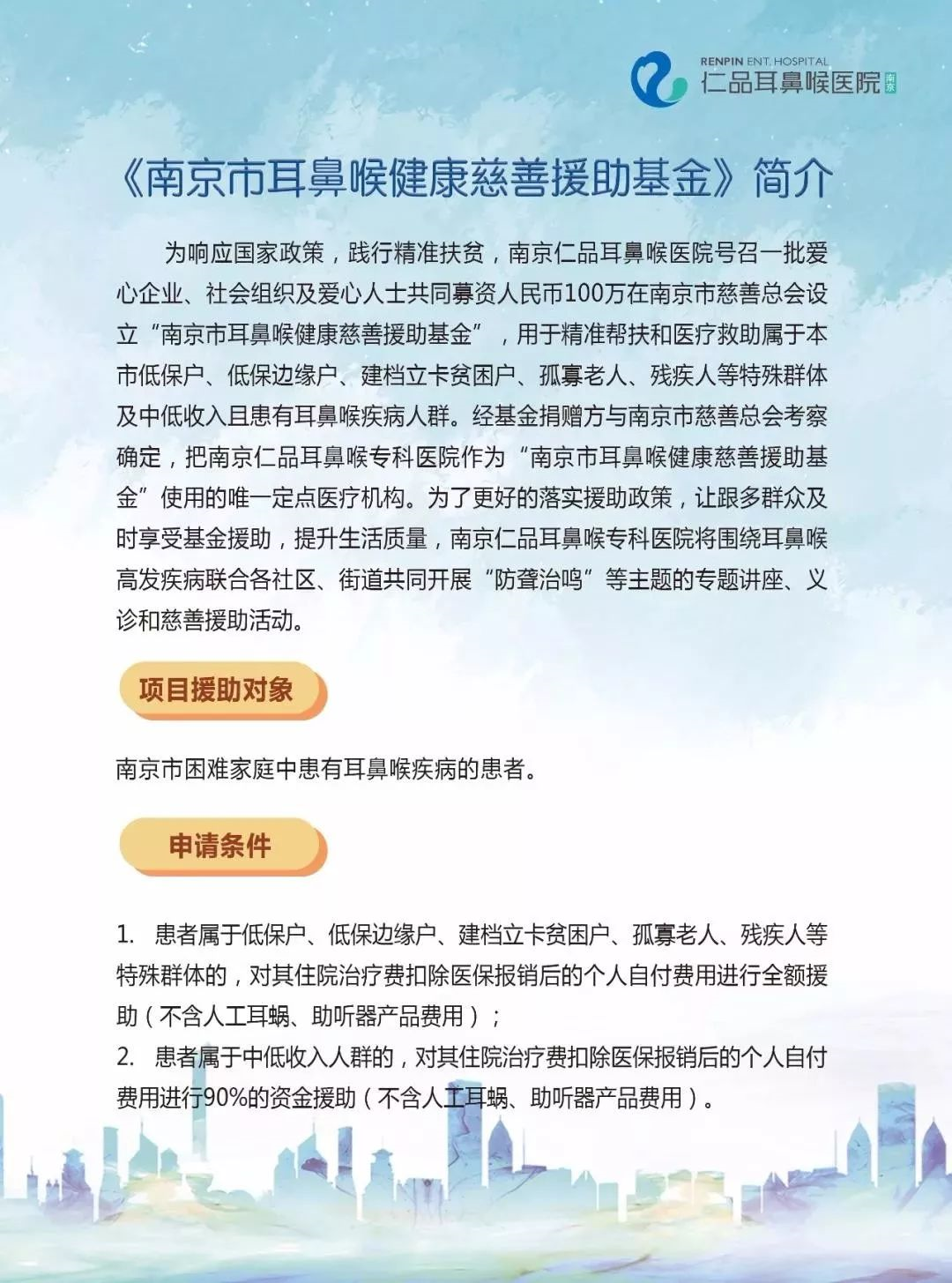 经基金捐赠方与南京市慈善总会考察确定,把南京仁品耳鼻喉专科医院作为“南京市耳鼻喉健康慈善援助基金”使用的唯一定点医疗机构。
