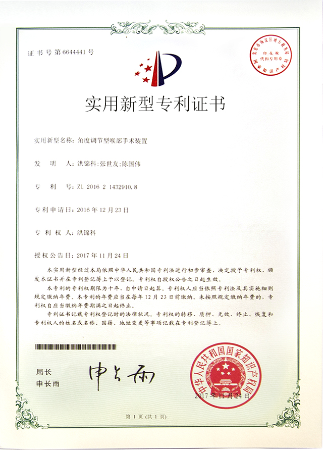 此次洪锦科院长获得发明专利,不仅是对洪院长个人不懈努力的肯定,更坚定了仁品耳鼻喉医院创新医疗的决心。